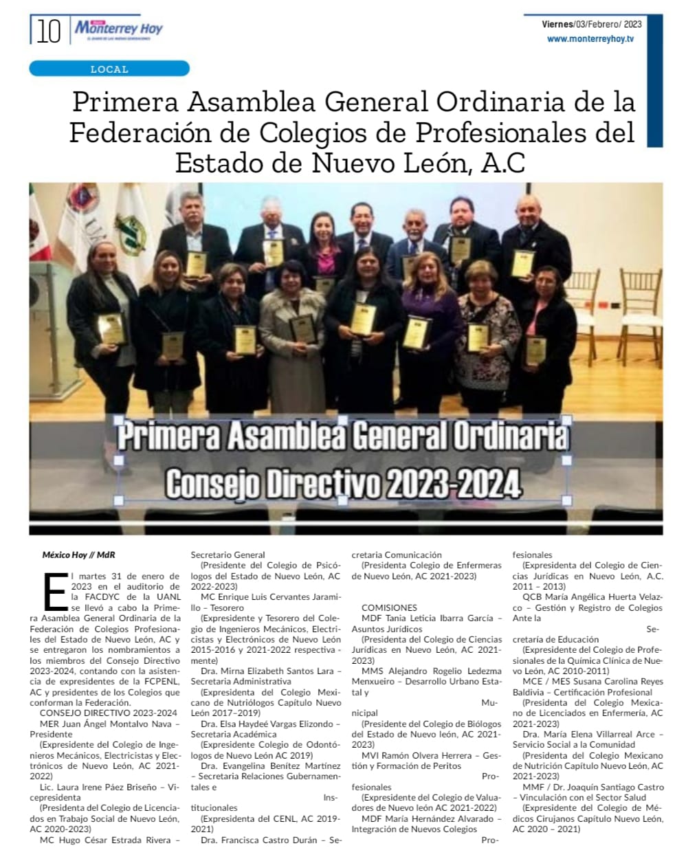 El martes 31 de enero de 2023, la Federación de Colegios Profesionales del Estado de Nuevo León, AC, llevó a cabo en el Auditorio de la FACDYC de la UANL, Campus Loma Larga, primera Asamblea, en la cual se hizo entrega de los nombramientos a los miembros del Consejo Directivo Leer más
