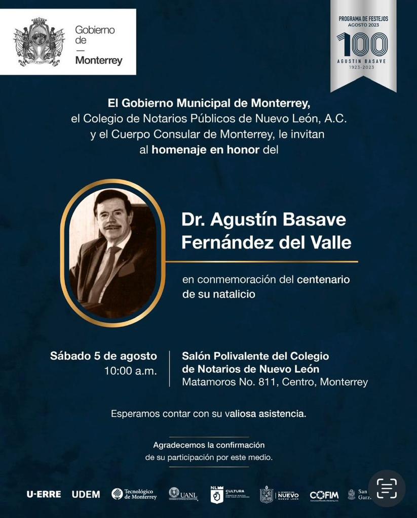 El sábado 5 de agosto de 2023 el Gobierno de Monterrey, el Colegio de Notarios Públicos de Nuevo León, AC y el Cuerpo Consular de Monterrey, rindieron homenaje al Dr. Agustín Basave Fernández del Valle en conmemoración del centenario de su natalicio. El evento se llevó a cabo en el Leer más