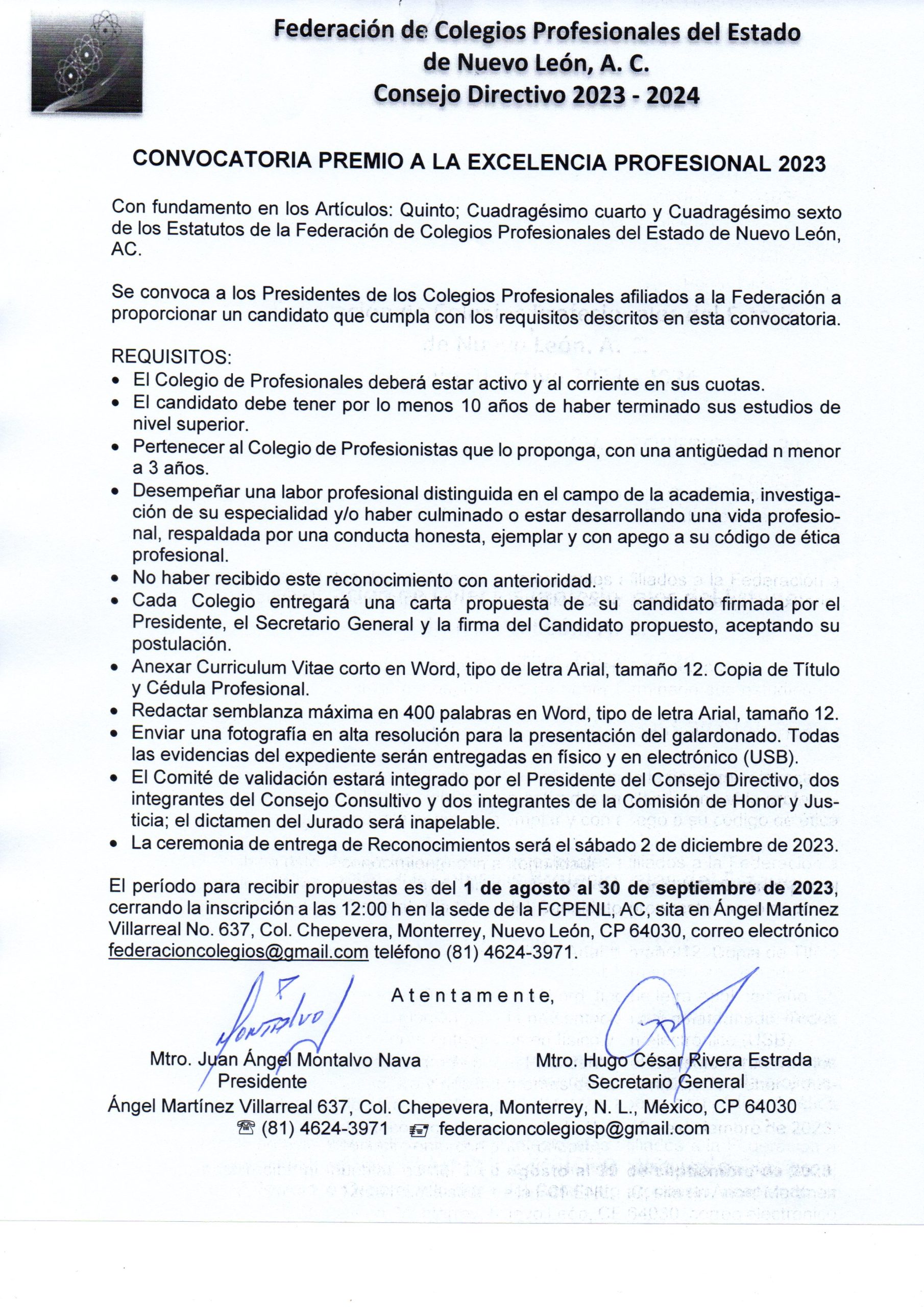 La Federación de Colegios Profesionales del Estado de Nuevo León, AC, convoca a los Presidentes de Colegios de Profesionales afiliados a participar en el PREMIO A LA EXCELENCIA PROFESIONAL 2023 con la cual podrán proponer a un candidato que cumpla con los requisitos descritos en la convocatoria. El período para Leer más