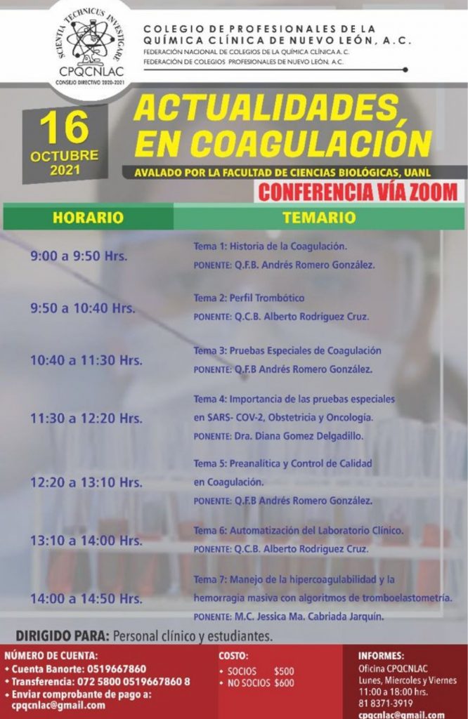El Colegio de Profesionales de la Química Clínica de Nuevo León, A.C., en coordinación con la Federación Nacional de Colegios de la Química Clínica, A.C. y la Federación de Colegios Profesionales del Estado de Nuevo León, A.C. invitan a Usted a la interesante Conferencia de «ACTUALIDADES EN COAGULACIÓN» que se llevará a cabo VÍA ZOOM el próximo 16 de octubre de 2001. Esta conferencia está dirigida al Personal clínico y estudiantes. Se anexa el poster con toda la información del evento.
