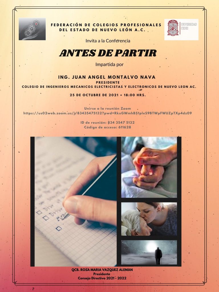 La FEDERACIÓN DE COLEGIOS PROFESIONALES DEL ESTADO DE NUEVO LEÓN, A.C., Invita a la Conferencia «Antes de Partir» impartida por el ING. JUAN ANGEL MONTALVO NAVA, Presidente del Colegio de Ingenieros Mecánicos, Electricistas y Electrónicos de Nuevo León, A.C., que se llevará a a cabo el día 25 de octubre de 2021 a las 18:00 hrs.
